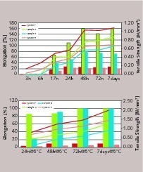 Results are self-explanatory and we could state that after 24 hours both at room temperature and at 5 °C the membranes prepared with the new binders have developed more than 80 % of the total mechanical strength and the absolute value is so high, that membranes are already water proof even under the highest pressure conditions.