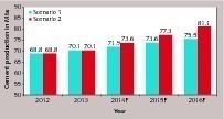 Figure 16 provides an outlook for the cement production until 2016 with a 2.5 % and 5.0 % annual growth scenario. In Scenario 1 the cement production will increase from 70.1 Mta in 2013 to 75.5 Mta in 2016, while in Scenario 2 cement production will increase to 81.1 Mta. When taking 80 % of the new capacity additions into account the cement capacity will increase from 83.2 Mta in 2013 to 102.4 Mta in 2016 (Fig. 17). The figure depicts how cement capacity utilisation will develop with the new capacity from the two production scenarios. Taking Scenario 1 the utilisation will decline from 84.3 % in 2013 to 73.7 % in 2016, in Scenario 2 the utilisation will decline to 77.5 % in 2015 and later increase again to 79.2 % by 2016.