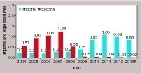 Figure 5 shows the development of cement consumption, which goes almost in line with cement production and nearly doubled from 35.7 Mta in 2007 to 70.5 Mta in 2013, according to the National Union of the Cement Industry (SNIC). Brazil’s per capita cement consumption climbed from 197 kg to 355 kg last year. At the moment Brazil has a population of nearly 200 million, the annual population growth rate is 1.3 %. Cement imports and exports are relatively small (Fig. 6). Until 2008 exports were larger than imports and now exports stand at 0.02 Mta, while imports (incl. white cement) increased to more than 1 Mta in 2009. In 2012 the main imports were from Cuba (0.261 Mta), Turkey (0.188 Mta), Spain, and Vietnam (0.121 Mta, each) and Portugal (0.097 Mta). About 77 % of the imports were made by the North and North East regions.