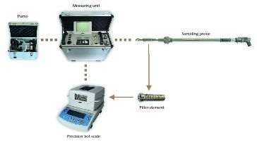 For this purpose, a particle-laden sample of gas is taken under defined conditions from the waste gas flow and fed through a filter sleeve or a plane filter. The unladen weight of the filter is determined after its elaborate pre-conditioning. Conditioning is then repeated, and the weight of the laden filter then measured. This is normally done in an analytical laboratory.