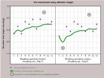 Figure 7 shows typical measured data obtained from multiple weighing operations on two measuring days, each of eleven weighing operations. The weight differences between the averages determined are less than 0.25 mg even after only the fifth repeat weighing. Even severe fluctuations caused, for example, by a large deviation in an individual weighing (see indication in Figure 7) influence the average only insignificantly.