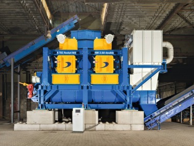 The semi-mobile version named A TEC Rocket Mill 2.00 single is a compact version installed in a container. The mill consists of one grinding chamber of approx. 2 m in diameter and 315 kW installed power at the main drive. This will give roughly half the capacity of the double chamber Rocket Mill 2.50. The throughput when producing RDF for the main burner (90 % < 50 mm) is about 10-12 t/h. Due to the compact equipment, the required installation space is very small. This new development also gives clients the possibility to test their own product on-site. Depending on the existing situation only a small amount of connecting work to the existing equipment is necessary.
