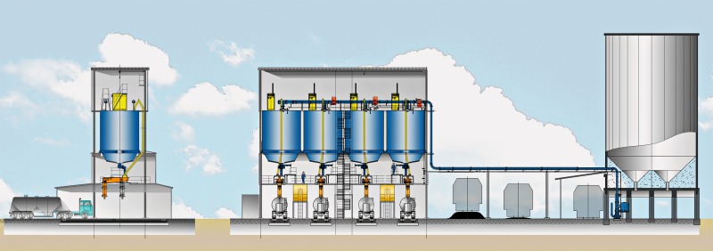 Claudius Peters supplies four silo conversions, after the modification the storage silos will be equipped with a new bottom aeration and a new discharge system. For the conveyance of the cement to the new loading plants two Fluidcon lines each with a capacity of 300 t/h and each with a 1 X-pump size 350 will be supplied. Four truck loading plants with a capacity of 200 t/h are also part of the scope of supply.