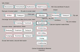 To demonstrate material flows and cumulated energy requirements, we combine the model plant with a 200 MW coal power plant for CO2 supply. Many coal-fired power plants in the USA are operating so far with stack temperatures in the range of 150 °C [9], e. g. for avoiding fouling and corrosion due to sulfuric acid condensation. Calera uses this waste heat in its technology. For this investigation, a modern plant was chosen because in a long-term view all power plants (in the USA as well) will be energetically optimized for sustainability reasons [9] and all considerations should be valid for these plants too. Selected parameters of operation of the coal power plant and the model production plant are shown in Table 1. For the production of 13.3 tons of vaterite per hour, an amount of 5.9 tons of CO2 per hour has to be supplied and therefore separated from the flue gas. This accounts for 4 % of the total CO2 emissions of the reference plant.