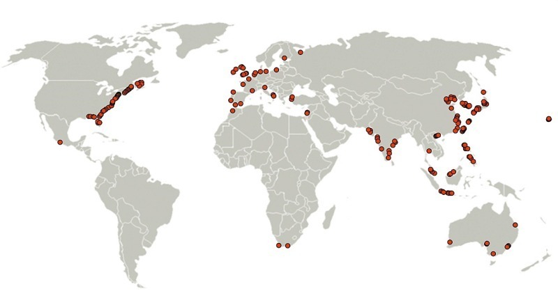 As calcium resources, we discuss two contrary cases: In case 1, sea water is in focus, Calera’s initial vision, an approach which is still not explicitly rejected. We assume that Calera technology can use the discharged seawater before it is released to the ocean, similar to desalination plants which are adapted to power plants for cooling the heat generating section. However, the use of seawater as resource could be hindered by U. S. Regulations in future [10, 11]. The U.S. Environmental Protection Agency (EPA) is in the process of issuing standards for the use of cooling water at existing U.S. power plants to reduce the environmental impacts from once-through cooling. Seawater cooling systems can negatively affect organisms in the aquatic ecosystem. Therefore, it cannot be excluded that seawater for Calera technology must be extracted separately which is optionally included in the balances. Fig. 4 shows a global map of selected costal coal power plants (< 10 km distance from coast). Manufacturing sites which are more than 10 km away from the source are likely to be economically inappropriate. In this variant it is assumed, that pipelines are not longer than 1 km and that the technological conditions are comparable to the manufacturing of magnesia/magnesite from sea water, as demonstrated in Figure 3.