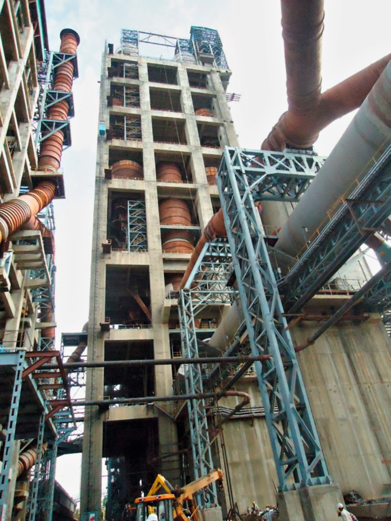 The scope of the 8000 t/d pyro processing system (Fig. 2, 3) includes the design, engineering, manufacture and supply of the complete array of equipment to build up a modern pyro processing system. It features a CF silo for homogenising and storing raw meal with a capacity of 24000 t and bulk density of 0.9 t/m³. With a six-stage twin string Inline Calciner (ILC), its preheater was designed to optimise fuel and power consumption and minimise emissions. The rotary kiln was lit up on 17.08.2014 and was soon producing the desired clinker output of 8000 t/d.