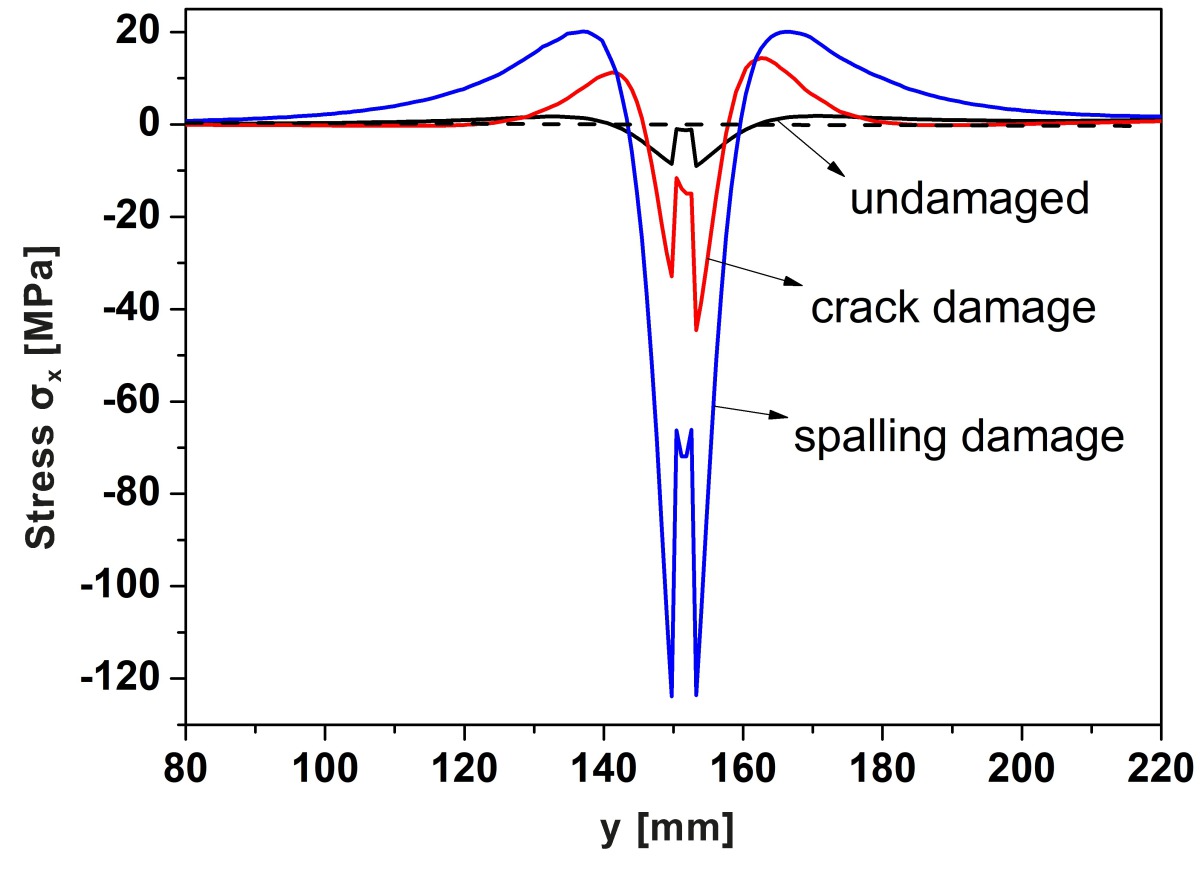 Figure 11 shows the x-direction stress distribution in the middle of the mortar and near the upper joints at t =10 s when the heating surface temperature rises rapidly from 200 °C to 1000 °C within 10 s. It is obvious that as the damage intensifies, the stress increases. The x-direction stress near the mortar (x = 15 mm) is shown in Figure 12. Under the condition of rapid heating on one side, the stress difference between the two sides of the joints and the stress change rate near the joints of the three models are quite different. Therefore, under thermal shock conditions, the x-direction stress near the damage is determined by both the axial stress and the bending stress. This can partly explain that the damage caused by thermal shock is greater than that under isothermal conditions, namely, the damaged structure has only large bending deformation under isothermal conditions, while there are both axial deformation and bending deformation under thermal shock.