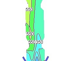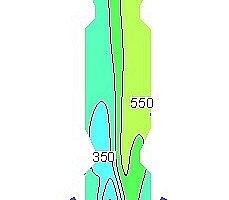Figure 7 shows the NOx concentration contours in the precalciner. This paper only considers fuel NOx, and assumes that the NOx concentration passing from the end of the kiln into the precalciner is 1000 ppm. The pulverized coal burns in the low oxygen environment in the cone of the precalciner. This produces a large amount of CO (see Figure 6e) and reduces the NOx in the exhaust gas, resulting in a sharp reduction of the NOx concentration in the cone of precalciner to about 300 ppm. The combustion of pulverized coal near the tertiary air produces some of the fuel NOx, which increases the concentration of NOx in this area to 450 ppm. However, the production of fuel-type NOx is inhibited with the increasing uniformity of temperature in the precalciner and the decrease in O2 concentration. The average concentration of NOx in the precalciner column therefore increases but the concentration gradient decreases until the concentration of NOx at the outlet stabilizes at an average value of 523 ppm.
