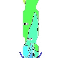 An approximation of the linked processes of pulverized coal combustion and raw meal decomposition in the precalciner can be gained by combining Figure 5 and Figure 6. The pulverized coal enters the bottom of the precalciner where some of the CO is produced by incomplete combustion of the pulverized coal due to the low local oxygen concentration. As the gas flow moves upwards the pulverized coal then begins to burn violently near the tertiary air with a high oxygen concentration. This produces CO2 and CO and also generates high local temperatures. In the high temperature environment the raw meal absorbs the heat generated by pulverized coal combustion and reacts violently. A large amount of the CaCO3 is then decomposed into CaO and, at the same time, a low temperature zone is generated in the area where the CaCO3 is decomposed (see Figure 5). However, the continuous combustion of pulverized coal means that the temperature gradually rises again until it is stabilized.