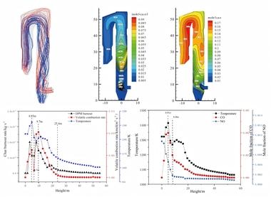 Figure 6 shows the mass fraction distributions of each component in the precalciner. Figure 6a indicates that the oxygen comes mainly from the tertiary air so the concentration of oxygen tends to be the highest near the tertiary air and then exhibits a decreasing trend. The oxygen concentration in the upper part of the precalciner tends to be stable with a mass fraction of 0.012. Figure 6b is the mass fraction distribution diagram for CO2. It can be seen that the CO2 concentration exhibits a sharp increase in the vicinity of the four coal injection pipes, reaching 0.31, and the mass fraction at the exit is 0.28. Figures 6c and 6d are the mass fraction distribution diagrams for CaCO3 and CaO, which indicate that the CaCO3 decomposes rapidly. The rate of decomposition also increases rapidly due to the absorption of large quantities of heat. During this process the decomposition of CaCO3 produces a large amount of CO2. This leads to a rise in the CO2 partial pressure in the precalciner and inhibits the decomposition of CaCO3, resulting in a decrease in the rate of decomposition. Figure 6e is the mass fraction diagram for CO and indicates that a large amount of CO is generated in the cone of the precalciner. The local high temperature produced by coal combustion results in the reaction of char and CO2 to produce CO. The concentration of CO is therefore highest in the area of pulverized coal combustion. The CO then continues to burn in the upward gas flow until it is completely burnt out.