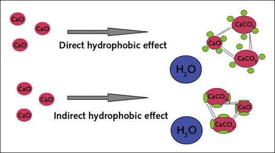 For a certain hydrophobic effect, it is sufficient to cover the most active surfaces of the building material, e. g. edges and spikes [1]. Therefore the conclusion is evident, that a product with a high specific surface offers the best results. Since the determination of the specific surface is complex, it is much easier to compare the bulk density of various products; keeping in mind that it is directly linked to the specific surface. Metallic soaps with low bulk density conversely have a higher specific surface (Table 1). It is also evident from Table 1 that a milling process is not suitable to achieve a higher hydrophobic effect, the product with a higher sieve residue offers better properties.