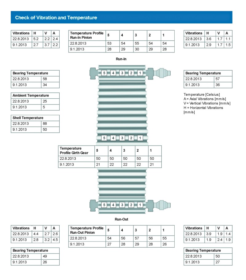 A service report should include customer information, gear data, photo and/or video documentation, results of the lubrication system check and all measurements, comments, trends, and other visual documentation such as infrared pictures. All data, previous and current reports, trend analyses and vibration recordings of a serviced gear should be accessible to the customer/operator as soon as possible. This means that the report has to be finished without delay, preferably on site. The ideal situation is that the customer has, for example, an App on a mobile device, either Android or iOS, and is notified of the new report which is then accessible immediately.