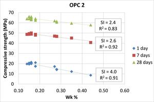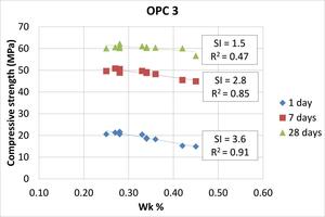 The slopes of the linear trend lines in Figure 2 can be used to estimate the degree of strength reduction for each cement type and age, in units of MPa of strength lost per 0.1 % increase in Wk, which we will refer to as the strength index (SI). Those values, together with the R2 values of the trendlines, are shown in the plots. For all cements, the SI values are largest at early ages, indicating that younger mortars are affected more strongly by pre-hydration. By 28 days some of the initial strength loss appears to have been recovered. The SI values suggest that the magnitude of the correlation between strength and Wk is cement-dependent.