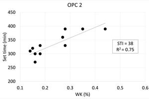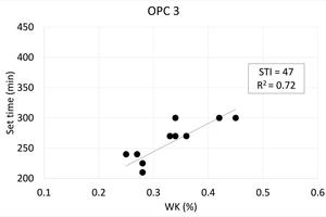 The cement hydration kinetics in the first 24 hours of hydration are also greatly affected by pre-hydration. As an example, Figure 3 shows the isothermal calorimetry curves of EN-196 mortars prepared with OPC 1 exposed to 50oC, 75 % RH for up to 24 hours in trays. Set times can be estimated from such curves by determining the midpoint between the end of the induction period and the maximum of the main hydration peak. Figure 4 shows the set times plotted as a function of Wk for the three OPCs submitted to the exposure conditions listed in Table 3. Similarly to the approach taken to determine the SI values, a set time retardation index (STI) and R2 values are shown in these plots. Set times extension of 30 - 50 minutes for every 0.1 % increase in Wk were observed.