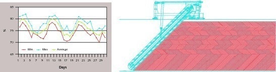 With regards to the chemical characteristics, it is well known that difficulties in efficient blending can be shown as a ratio between: sin = standard deviation of inlet material and sout = standard deviation of outlet material. This is strictly connected to the number of material layers in the storage silos and to the reclaiming system. This matter is treated in the following example. Figure 3 shows the operating mode of a Bel C type stacking and reclaiming system. There are two stacking system possibilities: