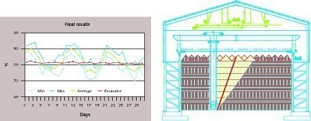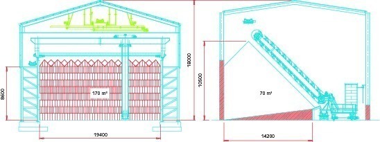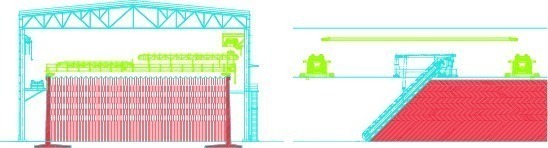 One important point to consider is the cost of the civil work. For this reason the company has tried to reduce the cost in developing a shed. A prefabricated shed completely fabricated with metal has been designed. All the supporting structure is formed with steel beams and the internal walls are prefabricated concrete panels. The Bel C reclaimer provides a very good ratio between the volume stored and the surface used. Figure 8 shows two typical sections demonstrating how, with the same shed height, the volume (which is stored in linear method) is higher with Bel C compared to a lateral reclaimer. This system is currently used in a clay storage yard.
