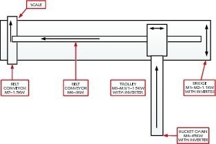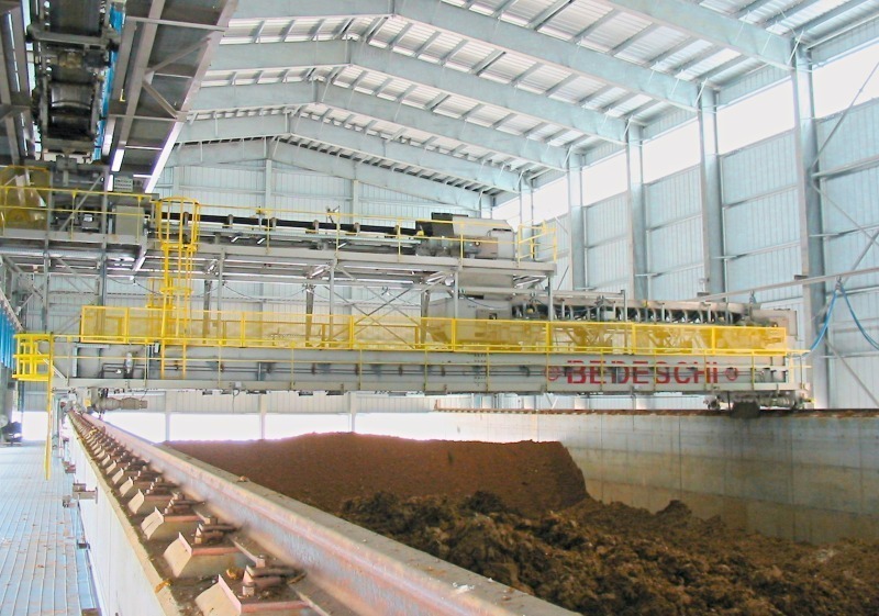 A reclaiming bridge moves on rails on the top of the side walls of the storage container. Due to the bridge and reclaimer being mounted on rails, it is possible to reclaim material from the whole storage surface. Reclaiming is carried out from the bottom of the pile. The buckets discharge the reclaimed material onto the belt conveyor on the reclaiming bridge. This system reclaims material from different layers ensuring that it is well blended. The blending will be discussed later in detail. All the company’s standard machines are controlled automatically and can be operated either: