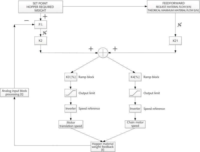 The output reference to the motor inverters is given by the sum of the feedforward term and the output of a PI controller. As could be seen starting from the bottom of the logical scheme, from the weighing system installed in the plant, the hoppermaterial weight feedback is measured, which is reasonably filtered before entering into the controller, in order to have an almost bumpless signal, which is then given as input to the PI controller, together with the hopper weight setpoint. At this point, the PI controller calculates the hopper weight error and acts with its proportional factor Kp and the integral factor Ki. The output of the PI controller is then multiplied by an adaptative constant K2 and this term is, then, added to the feedforward term.