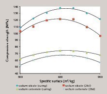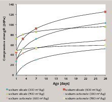 At the same time, the strength rate for S3-based AAS cement is relatively low, especially after 3 days of hardening. At the age of 1 and 3 days S3-based AAS cement shows the best results, average S2-based AAS cemeent, and the lowest S1-based AAS cement. At the age of 7 days the S2- and S3-based samples have similar strength values. They exceed the respective characteristics of the S1-based AAS cement by 20.6–38.4 % (alkaline component – sodium silicate solution) and by 74.6–92.9 % (alkaline component – sodium carbonate solution). Up to an age of 28 days the strength development rate of the S3-based sample decreases and its strength level approaches the S1-based samples. However, the maximum strength at the age of 28 days has the S2-based sample, which exceeds the characteristic of the S1- and S3-based samples by 21.2–30.4 % (alkaline component – sodium silicate solution) and 16.8–32,3 % (alkaline component – sodium carbonate solution).