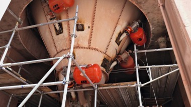 The compacted build-up continued to collect particles, effectively shrinking the internal space as the pneumatic blower forced more material through the silos. The severity of the problem became apparent to system operators when they noticed the walls of the silos actually starting to bulge outward (Fig: 1). During a shutdown and inspection, the staff could observe interior damage and decided that over-pressurization had compromised the structural integrity of the three storage vessels.