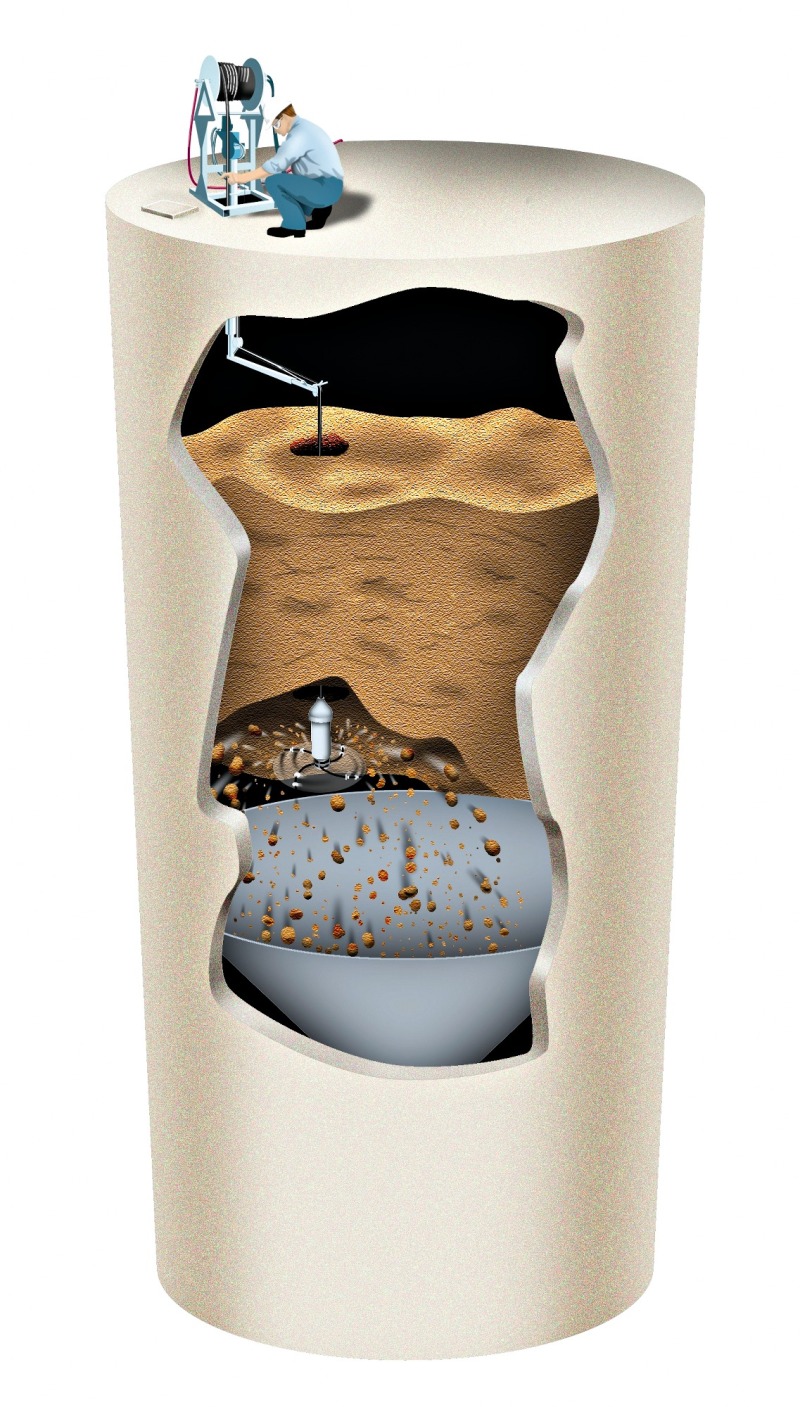 The Heavy Duty Whip is a portable, remote-controlled tool that can be lowered into storage containers through a manhole opening (Fig. 2). Powered by compressed air, the patented motor can use a variety of different flails and cutting edges to knock down accumulated material without damaging storage vessels. Abrasion-resistant steel chain is best suited for most applications, with non-sparking brass chain for combustible materials. Urethane flails can also be employed to protect lined vessels that could be susceptible to damage from metal tools.