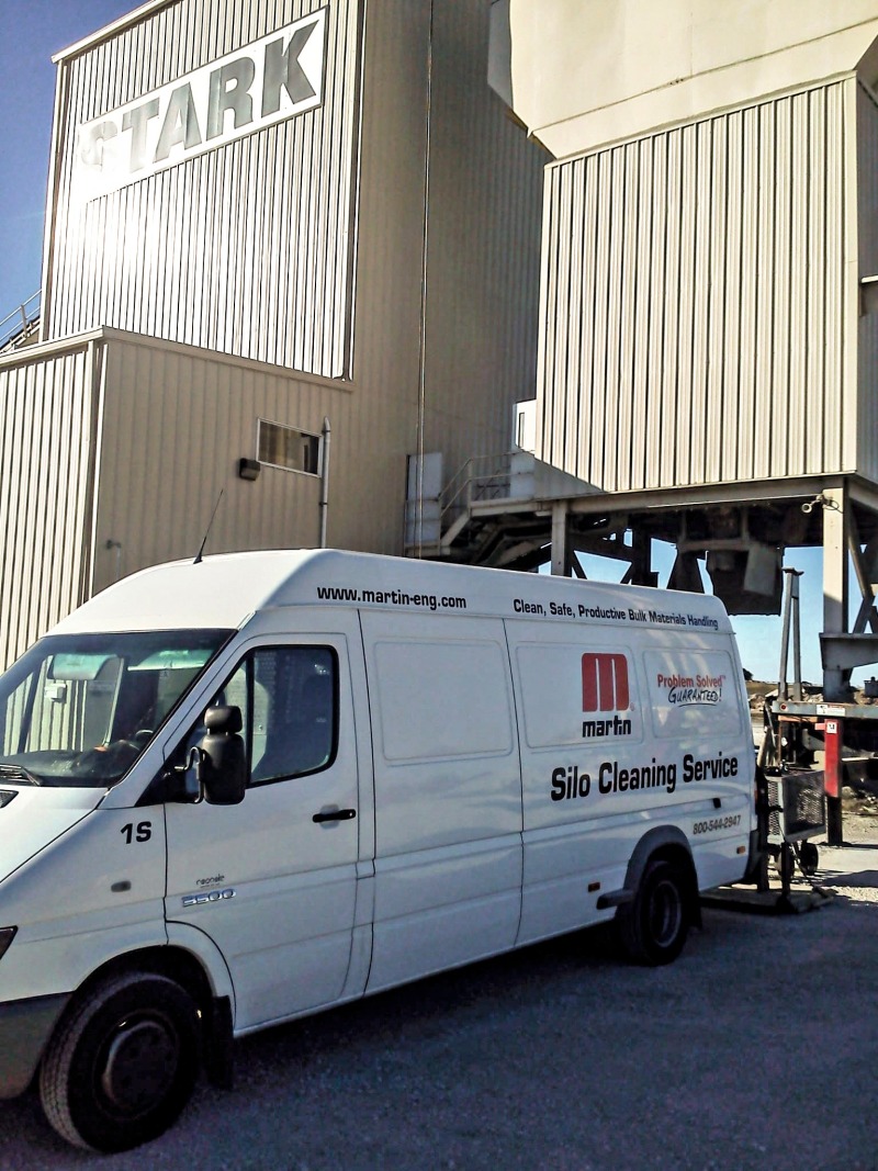 A ready-mix concrete plant in the Midwestern United States has resolved material build-up issues in three storage silos where accumulation had slowed production and increased internal pressures, eventually damaging the vessel walls and forcing a shutdown. By enlisting the services of a professional silo-cleaning crew from Martin Engineering (Neponset, IL), the Commercial Acres RMC facility owned by Stark Excavating was able to have all three silos safely emptied and ready for repair in just ten working hours, without confined space entry.