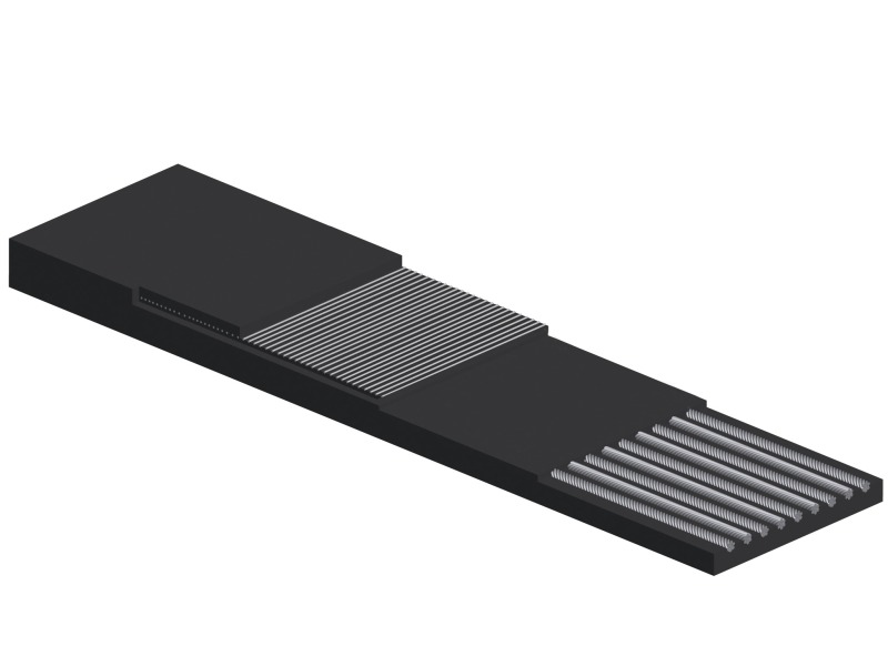 The STAHLCORD® Barrier is a steel cord conveyor belt with a rubber surface on the top cover, in which thin steel cords run closely together at right angles to the direction of travel of the conveyor belt. They protect the steel cords in the belt carcass and prevent impact breaks and longitudinal slitting in the conveyor belt. Thanks to low reference elongation and the short takeup linked to this, the barrier is ideal for use as an equipment belt in mining machinery or as a short- to medium-length device-related bench conveyor belt, for instance. It is also suitable for working environments where steel cord conveyor belts have to withstand impacts from coarse stone, as is the case with belt conveyors with several feeding points.