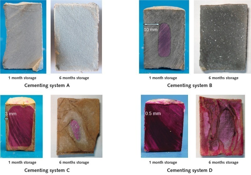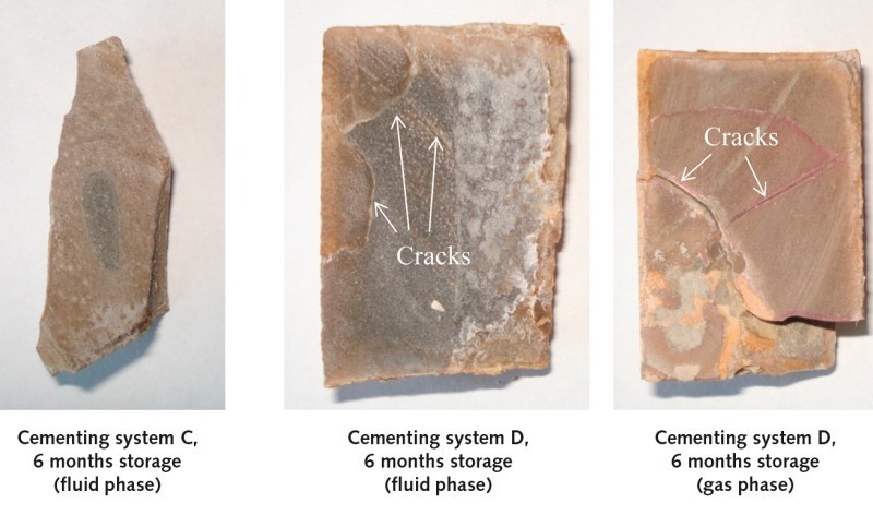 After six months’ storage, the test cylinders of cementing systems A, B and C showed complete carbonation (no alkalinity of the cement matrix). Only cementing system D (pure API Class G cement) retained its alkalinity. However, the system D samples showed considerable cracking, similar to the specimens made of system C cement.