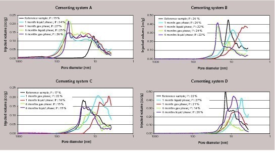 The total porosity of the samples made from cementing systems C and D remained very low, even after the exposure to CO2. For the latex polymer-based system C a value of ~ 15 vol.-% was measured and for the non-modified API Class G cement (system D) the porosity varied between 14 and 20 vol.-%. In both cases the pore size had hardly changed.