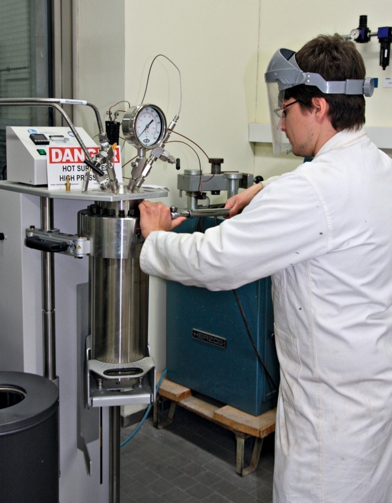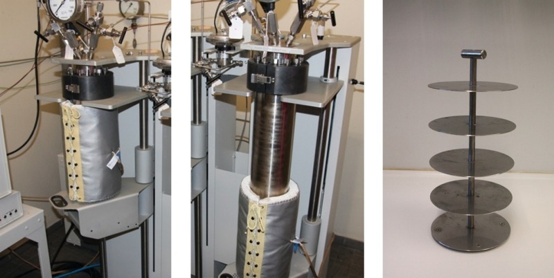 The hardened cement specimens were subsequently removed from the plastic containers and stored for a further 28 days at 90 °C and 400 bar pressure in synthetic reservoir water. This storage took place in 4 L stainless steel autoclaves (Fig. 2) from the Parr Instrument Company (Moline/IL, USA). The samples were subsequently stored in scCO2 in a static manner (without agitation), as this more realistically reflects actual storage conditions in oil and gas strata. For this purpose, 24 test specimens were placed on stainless steel racks, as shown in Figure 3, and these were put into 2 L stainless steel autoclaves (Parr Instrument Company, Moline/IL, USA). The autoclaves were subsequently half filled with synthetic reservoir fluids. Under these conditions, the bottom test samples were exposed to CO2 saturated water (liquid phase) while the top specimens were exposed to a CO2 phase (gas phase) that was saturated with water. The samples were stored for periods of one and six months at a temperature of 90 °C and a pressure of 400 bar. Under these conditions, the CO2 is in a supercritical state and is particularly aggressive to cement. As reference, a second row of test samples of all cementing systems were stored under the same conditions, but in a nitrogen atmosphere instead of CO2.