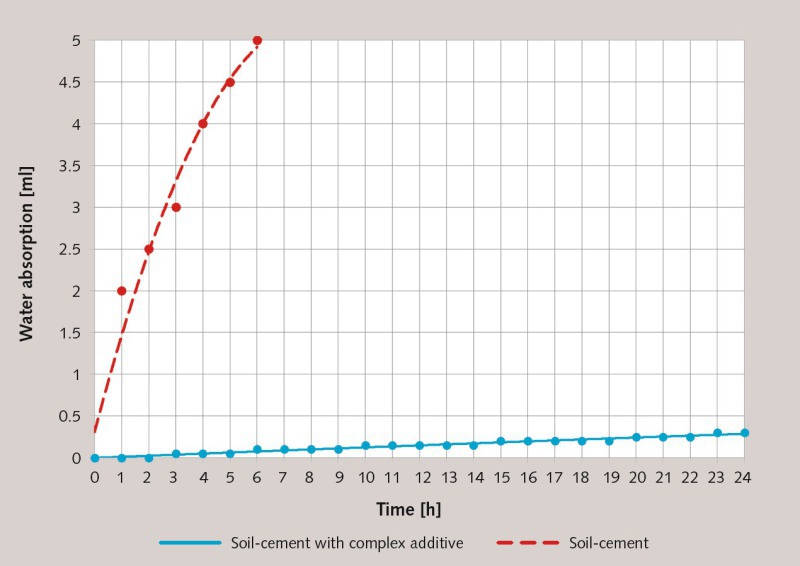 “The tube method” can be used to determine the hydrophobicity of materials that are constantly exposed to atmospheric precipitation since it characterizes the hydrophobicity not only at the surface but also in terms of material volume. Figure 3 shows that the introduction of a complex additive significantly reduces the absorption of water at low pressure. The control soil cement composition sample absorbed 5.0 ml of water in a period of six hours while 0.1 ml of water was absorbed by the soil cement sample containing the complex additive during the same period. This figure reached 0.3 ml after 24 hours from the beginning of the test.