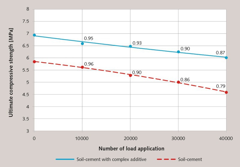 The road surfaces experience dynamic effects from the different moving loads [8]. Mechanical loads break down the molecular bonds, resulting in cracks and the destruction of the structure of the material. The variation in compressive strength after 4000 applications of the design load was used to establish the soil cement endurance when exposed to moving loads. The test results are shown in Figure 5.
