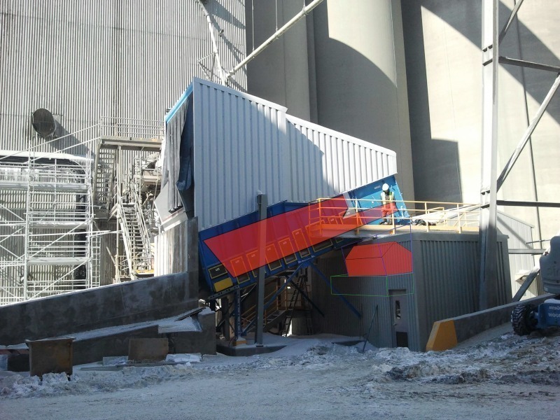 Aumund provided two Samson® feeder systems to Lehigh Cement at Edmonton in Canada (Fig. 2, Fig. 4). The task was to feed synthetic gypsum into separate finish mill lines. The material is loaded into the Samson® feeders by front end loaders. Through a weigh feeder and a TKF chain conveyor it is then fed directly onto the finish mill belt conveyor.