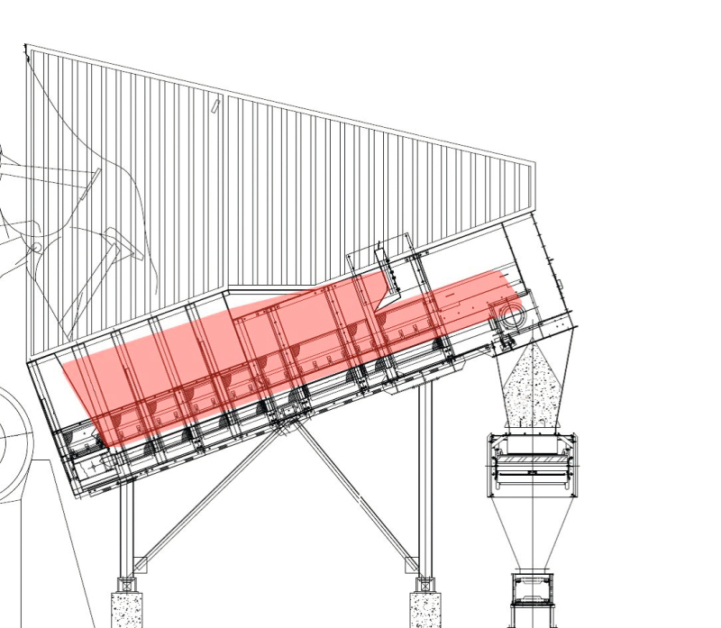 The SSF receives material directly from either rear tipping trucks or front end loaders. The entry section provides a certain storage capacity within the unit itself for initial material receiving with quick vehicle turnaround times, and the total amount of storage depends upon the application, material density, feed rate and size of the unit. The SSF keeps a constant level of material within its head chute to act as a surge bin which is then extracted at an either constant or variable rate determined by the customer by means of a weigh feeder, weighing belt or a similar device.