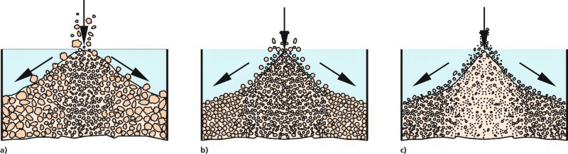 Segregation due to the sifting and to differences in the natural angle of repose for particles of different shape depends on the particles being sufficiently mobile. In other words, it does not tend to happen to bulk solids with poor flow properties. This type of segregation can be expected both for dry bulk solids with particle sizes beginning at roughly 100 µm, and for moist bulk solids showing adequate flow behaviour despite their moisture content (e.g., wet gravel sized 5 to 10 mm will segregate anyway, because the adhesive forces are of secondary importance). Segregation according to Figure 1c or due to cratering can occur in the presence of very fine fractions. However, no precise particle size limits can be defined, because other parameters such as the breadth of the particle size distribution or the shape of the particles are also involved. Remarkably, segregation can be observed for particle size ratios as small as 1:1.3 [7].