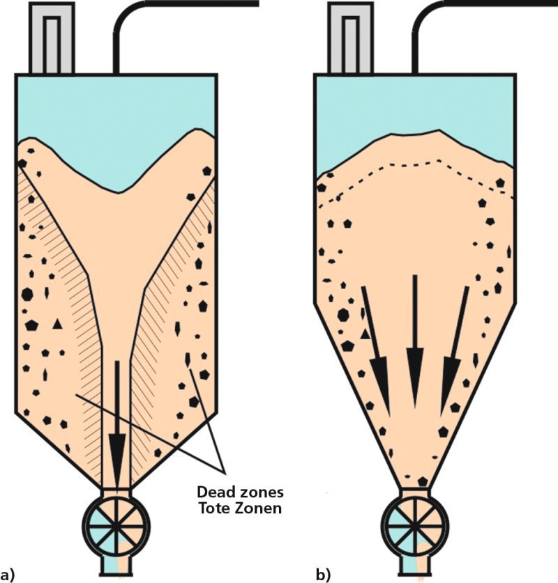 The term mass flow, in contrast to funnel flow (Fig. 6a), means that there will be no dead zones in which the sum of the material being extracted remains in place until most of the rest has been discharged. In a mass flow discharge process, all of the bulk solids stay in motion from the beginning to the end of discharge (Fig. 6b). For mass flow to be achieved, the hopper walls must be steep enough to prevent the occurrence of dead zones. The requisite slope angle can be determined on the basis of the measured flow properties, especially in terms of wall friction [1, 14]. It is also important that the feeder withdraws the bulk solid from the entire outlet section, that there are no inward-projecting rims, and that the silo/hopper has only one outlet opening [1].
