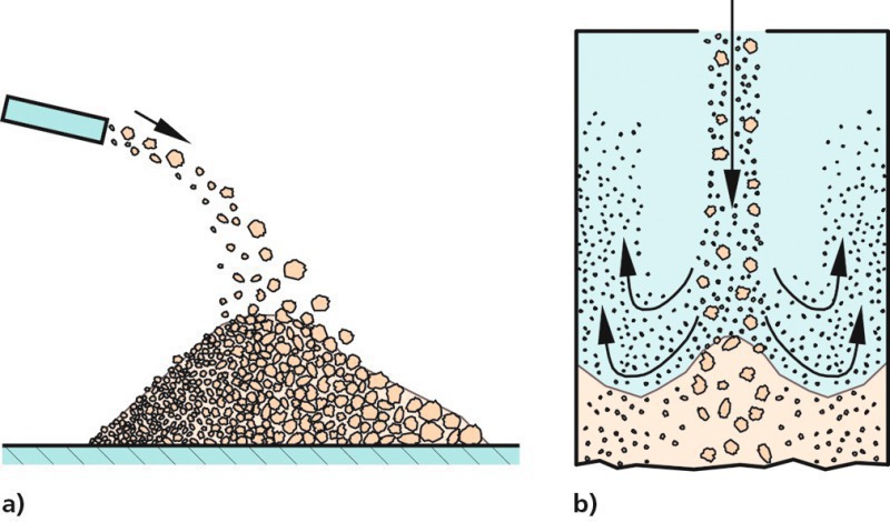 If a bulk solid is filled into a silo from above (Fig. 3b) sufficiently large particles drop quickly and collect at the centre of the heap, while the finer particles (reference value: < 50 … 100 µm [5, 12]) are pushed aside and even partly carried upwards by the flow of gas deflecting off of the surface of the heap. Sometimes, very fine particles are seen to adhere directly to the wall of the silo, where they form an increasingly thick layer that eventually separates from the wall by reason of its own weight. The aforementioned gas flow consists either of conveying air from the pneumatic filling system or of the air stream dragged by the particle stream.