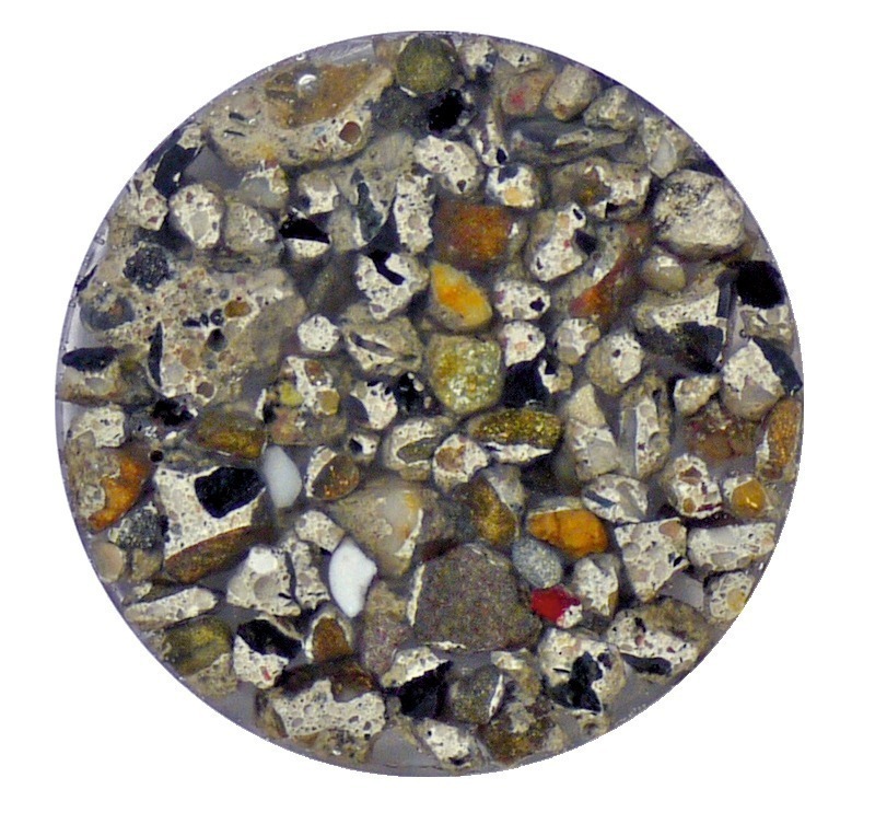 Concrete test blocks were produced using different mixtures of aggregates, but keeping a constant water-to-cement ratio and constant amount of added binder. Table 2 compares three comparable formulations and their results, which have been selected from the numerous test series. These formulations are mixtures of the following aggregate products:
