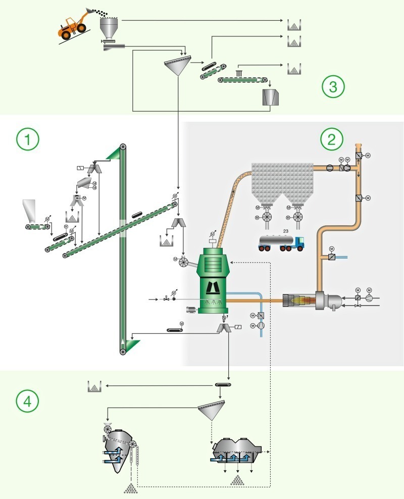 The objective of the comprehensive pilot plant tests was to demonstrate that the Loesche mill is able to perform this multi-stage process for transforming concrete granulate into a concrete aggregate, namely: