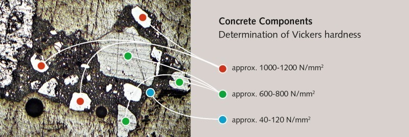 From the numerous measurement criteria that can be applied for characterising the strength of solid components, the authors decided to use the Vickers hardnesses of the individual components for the purpose of describing the comminution resistance. To enable this, a series of raw material tests was conducted at the Institut für Aufbereitungsmaschinen (Institute for Mineral Processing Machines) at the TU Bergakademie Freiberg, and the Vickers hardnesses were determined from polished sections prepared from relevant samples. Fig. 1 shows the great difference between the strength values of the examined individual concrete components.