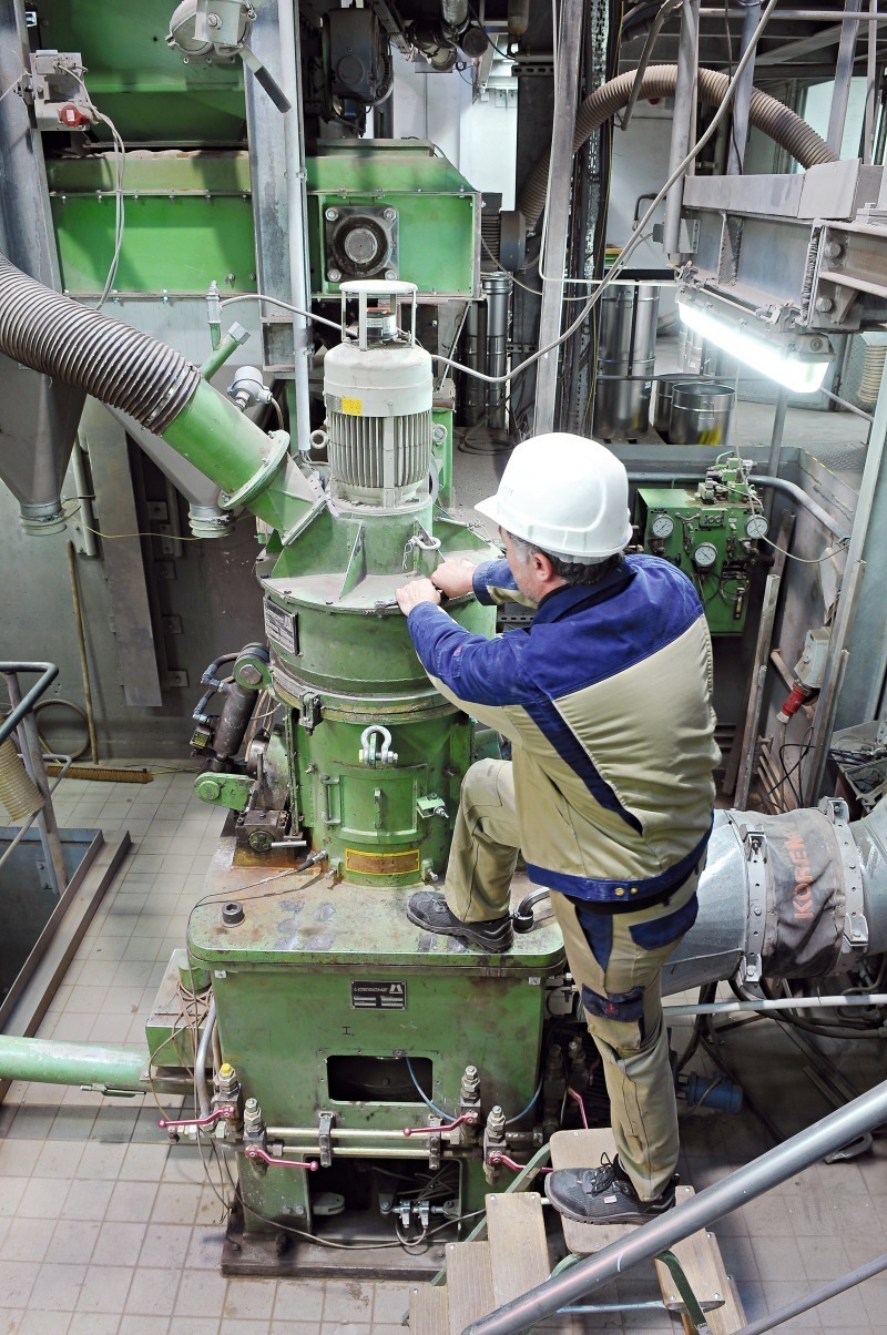 In contrast to the usual applications of the Loesche mill, in which the entire amount of feed material is ground to filler fineness, the tests required only 20-30 % of the feed material to be collected as classifier fines (filler). For this reason, the test mill was operated in “DUAL operation mode” (combined overflow/air flow mode).