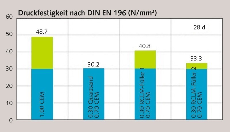 The increase in compressive strength due to the 30 % addition of RCLM filler, i.e. a filler with a content of more than 70 % ground hardened cement paste, proves that this filler possesses a substantial binding agent reactivity.