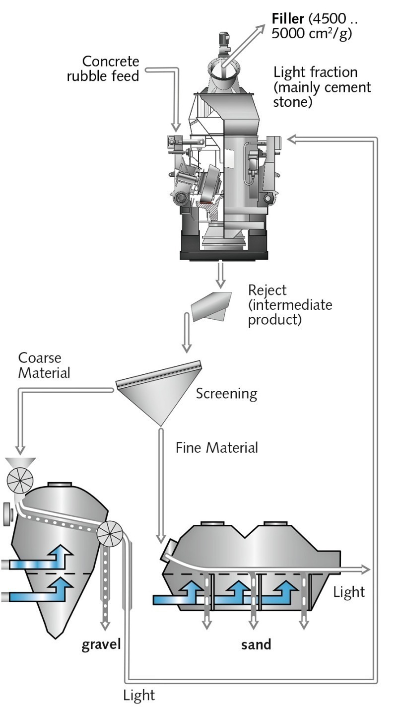Employing this principle, the described plant concept for producing aggregate materials from waste concrete combines disintegration in a Loesche mill with efficient density separation. In this case, dry separation systems are employed, as this is sensible and sound practice for use in combination with a dry grinding process.