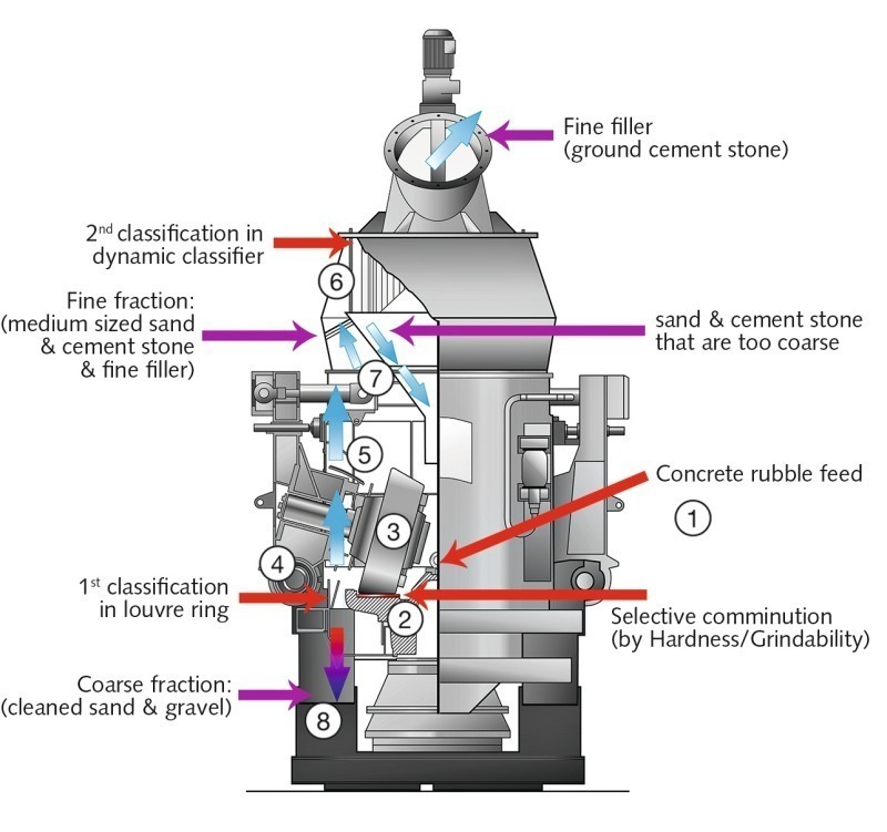 The air stream (5) entrains the finer and lighter material and transports it upward to the second classification stage, the dynamic classifier (6). This classifier collects the adequately fine-ground filler from the coarser material, the fine sand and the remaining mortar/hardened cement paste aggregates. These rejects pass through the classifier grit discharge cone (7) and are returned to the grinding process.