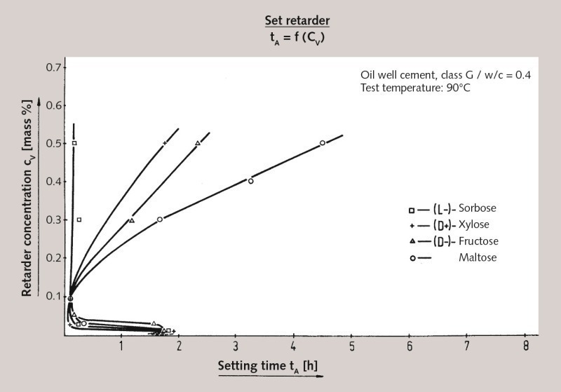 Industrial cellulose derivatives are available in a large number of modifications and molecular weight distributions. The most favourable and cost-effective use of these products as set retarders can only be determined through extensive tests. While anionic types of CMC are rarely suitable for cement suspensions, modified cellulose derivatives are predominantly stable to shear, temperatures up to about 140°C and are not sensitive to Ca2+-ions. Any hydrolysis products that appear are usually monosaccharides and short-chain polysaccharides.