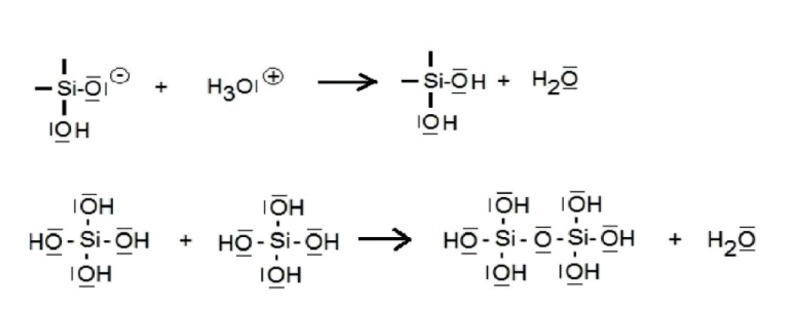 As is generally known, such colloid formations in waterglass solutions can lead to macroscopically observable sol-gel-transitions which are due to the increasing formation of condensable silanol groups in the case of acid additions (1) and finally show – according to simple viewing – result in flexible network structures with gel properties by condensation polymerization (2).