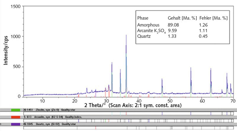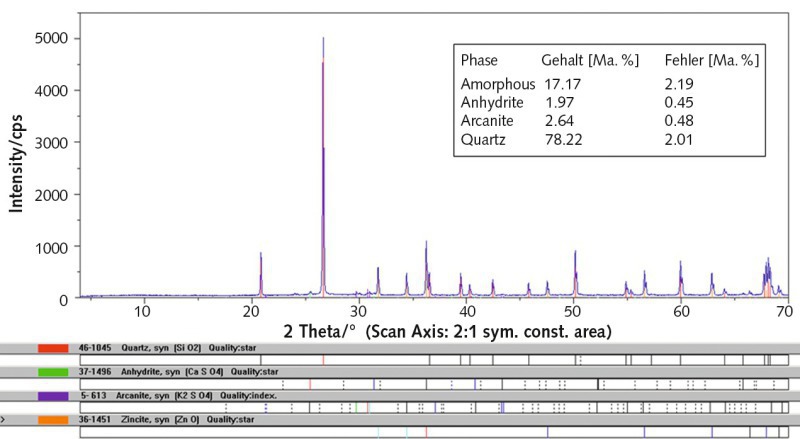 As expected, the X-ray phase analyse shows quartz as a crystalline main component (SiO2; 78.2 %), besides that, however, also arcanite (K2SO4; 2.6 %) and anhydrite (CaSO4; 2.0 %). For the silicatic network in the coats, an amorphous part of 17.2 % is found.