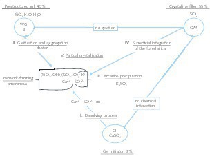Altogether, a process sequence that is outlined in Figure 11 results from the initial components waterglass WG B, fused silica QM and gel initiator GI (CaSO4, AII) for the essential reactions in coat formation.