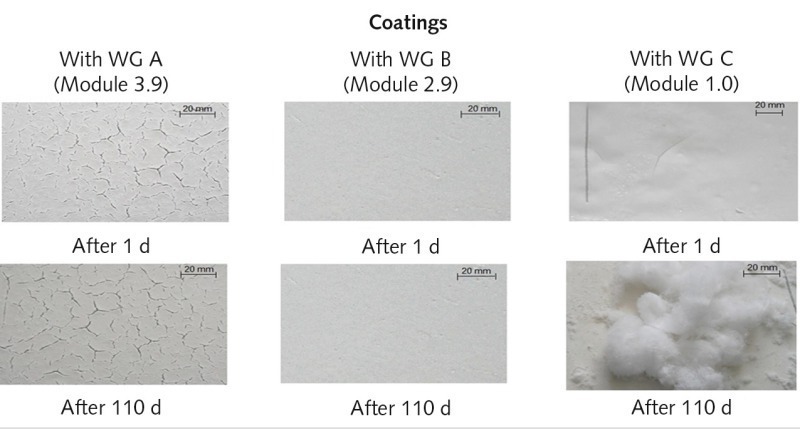 The coats with the WG B are characterized by a firm adhesion on the fiber cement plate while the coat with WG A due to too fast gelification with water inclusion (refer to Figure 2) already shows a marked cracking after 1 day and the coat with WG C shows noticeable efflorescences (voluminous salt efflorescence) due to insufficient networking and/or incomplete aggregation and high alkali contents after 110 days; the latter coatings do not reach any appreciable solidification in the investigation period, either (see scratch lines).