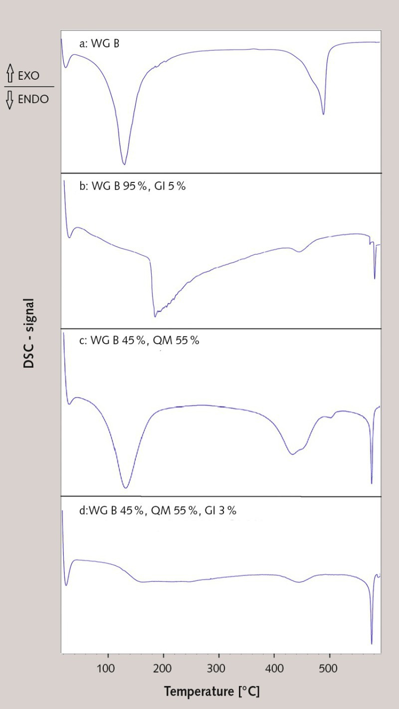 Finally, recording of the three component base mixture (WG B, QM and GI, Figure 9d) in the “time lapse” preparation proves a stable coat material formation in the form of a silicate network (glass transformation at 420 °C) with fused silica filling (quartz jump at 575 °C). Apart from that, no major dehydration (apart from surface water) can be found in this measurement which indicates a successful water discharge from the silicate network in the “time lapse” preparation (100 °C).